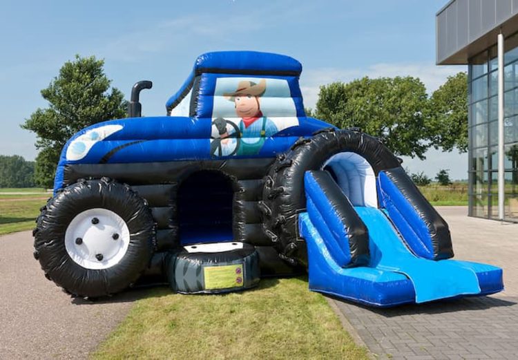 Überdachte Hüpfburg mit Rutsche im Stil eines großen Traktors.